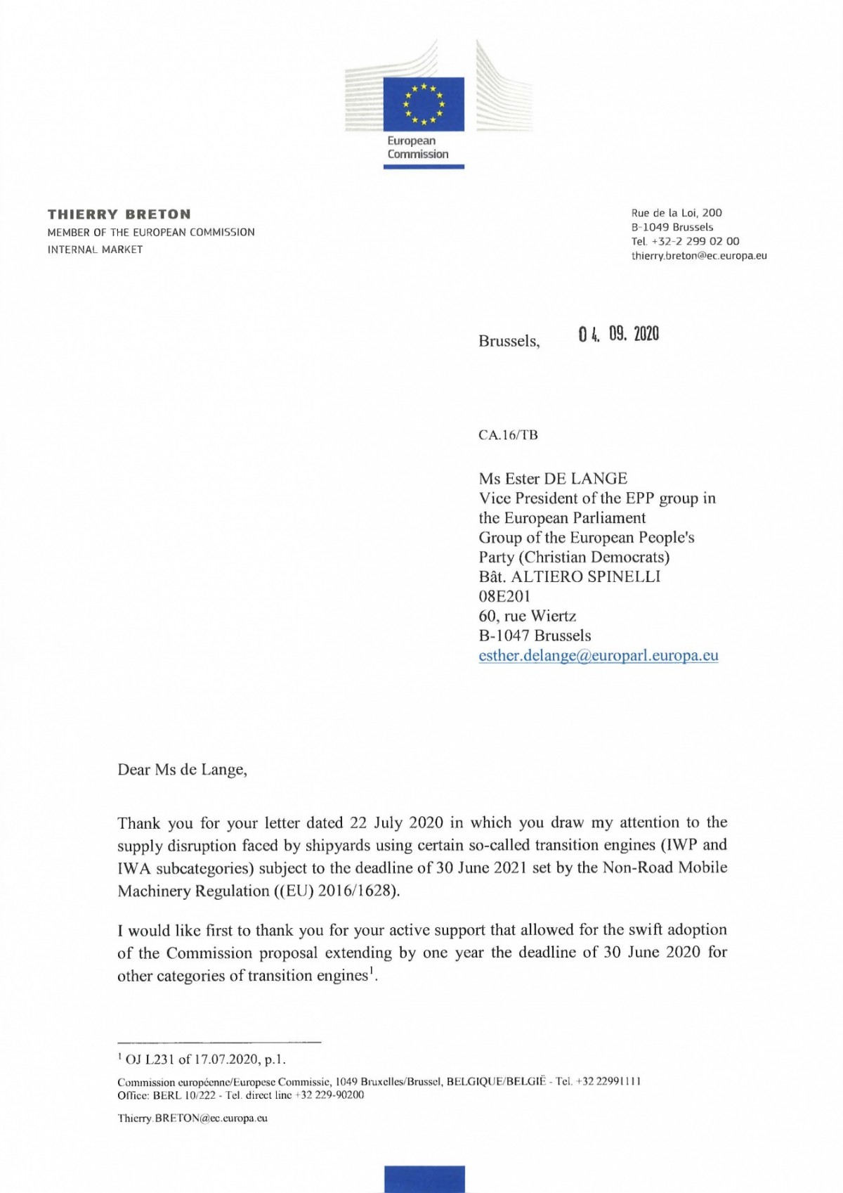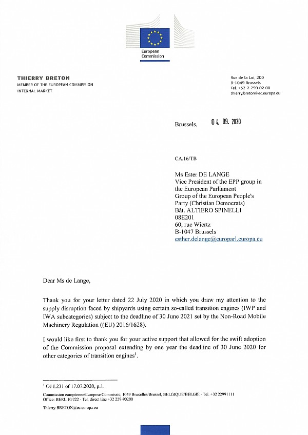 Ver carta enviada a Thierry Breton, Comissário da UE para o Mercado Interno, sobre a proposta de um regulamento adicional para alargar o período de transição apresentada pela Comissão Europeia aqui.