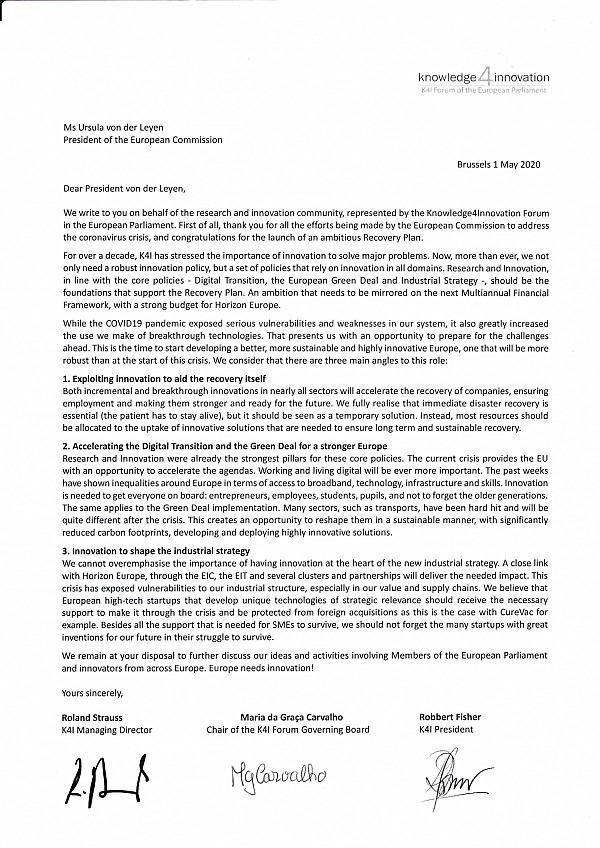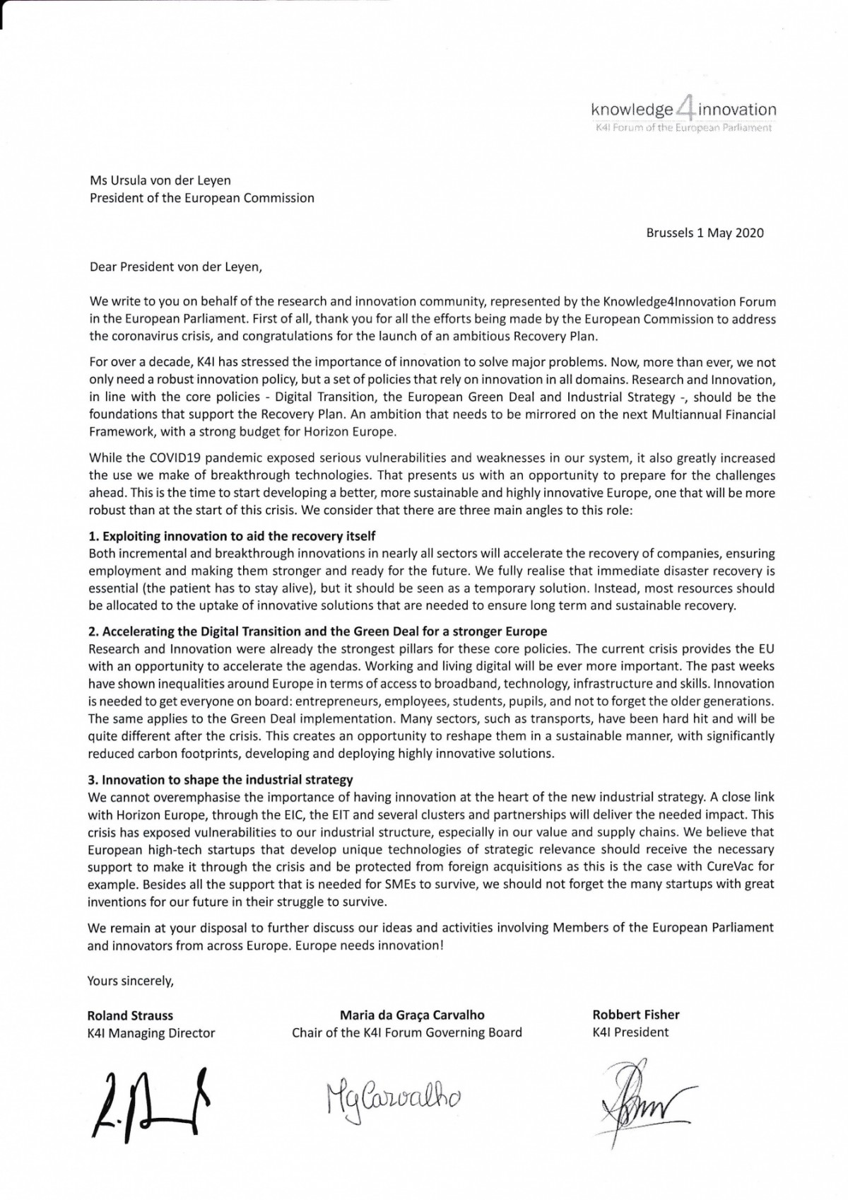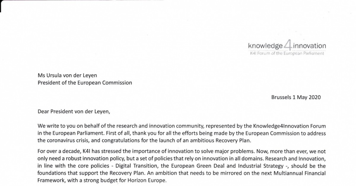 A direção do Knowledge for Innovation Forum (K4I) do Parlamento Europeu, que representa dezenas de eurodeputados e empresas, pediu, numa carta enviada à presidente da Comissão Europeia, uma forte aposta na Ciência e Inovação, já a partir do próximo Quadro Financeiro Plurianual (MFF), defendendo que essa será a melhor estratégia, não só para ultrapassar a presente crise, mas também para relançar o crescimento europeu.