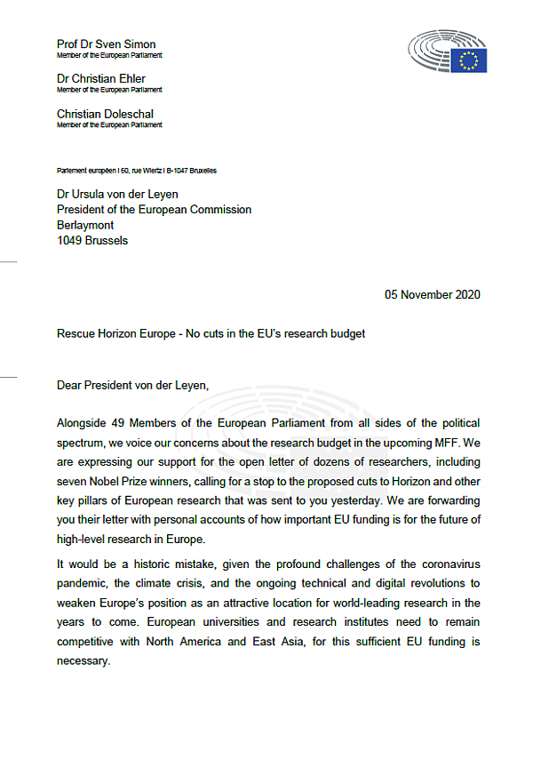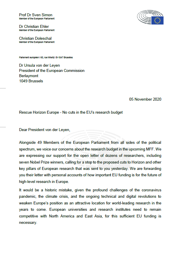Numa carta co-assinada por 49 dos seus colegas, incluindo o eurodeputado Christian Ehler, os aderentes à iniciativa avisam Ursula von der Leyen que aceitar um orçamento mais baixo para o programa-quadro para os anos 2021-27 seria acordado pelos líderes nacionais em julho “enfraqueceria a posição da Europa enquanto localização atrativa para a investigação de ponta” e seria um “erro histórico”.