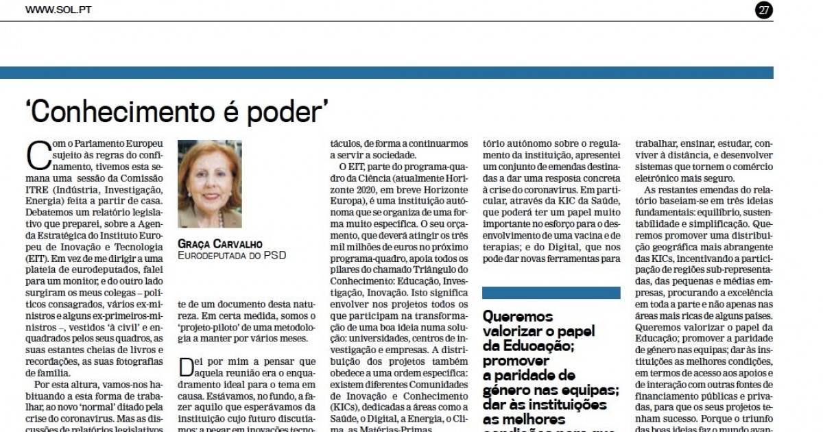 As restantes emendas do relatório baseiam-se em três ideias fundamentais: equilíbrio, sustentabilidade e simplificação. Queremos promover uma distribuição geográfica mais abrangente das KICs, incentivando a participação de regiões sub-representadas, das pequenas e médias empresas, procurando a excelência em toda a parte e não apenas nas áreas mais ricas de alguns países. Queremos valorizar o papel da Educação; promover a paridade de género nas equipas; dar às instituições as melhores condições, em termos de acesso aos apoios e de interação com outras fontes de financiamento públicas e privadas, para que os seus projetos tenham sucesso. Porque o triunfo das boas ideias faz o mundo avançar. Como disse Francis Bacon, na frase que dá o título a esta crónica: “conhecimento é poder”.