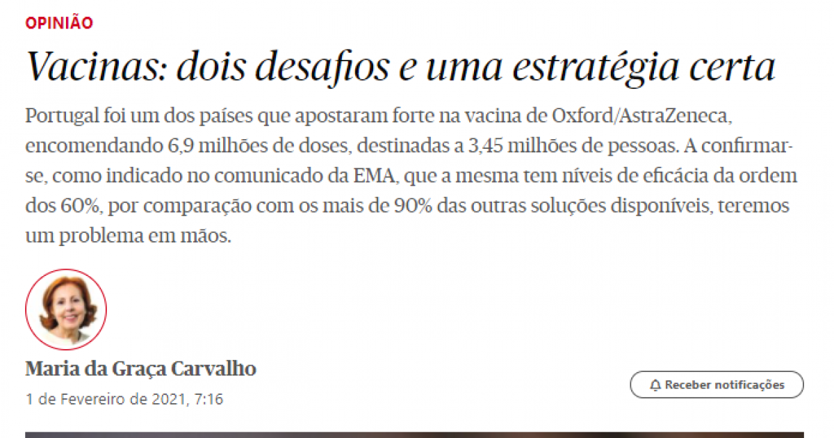 Portugal foi um dos países que apostaram forte na vacina de Oxford/AstraZeneca, encomendando 6,9 milhões de doses, destinadas a 3,45 milhões de pessoas. A confirmar-se, como indicado no comunicado da EMA, que a mesma tem níveis de eficácia da ordem dos 60%, por comparação com os mais de 90% das outras soluções disponíveis, teremos um problema em mãos.