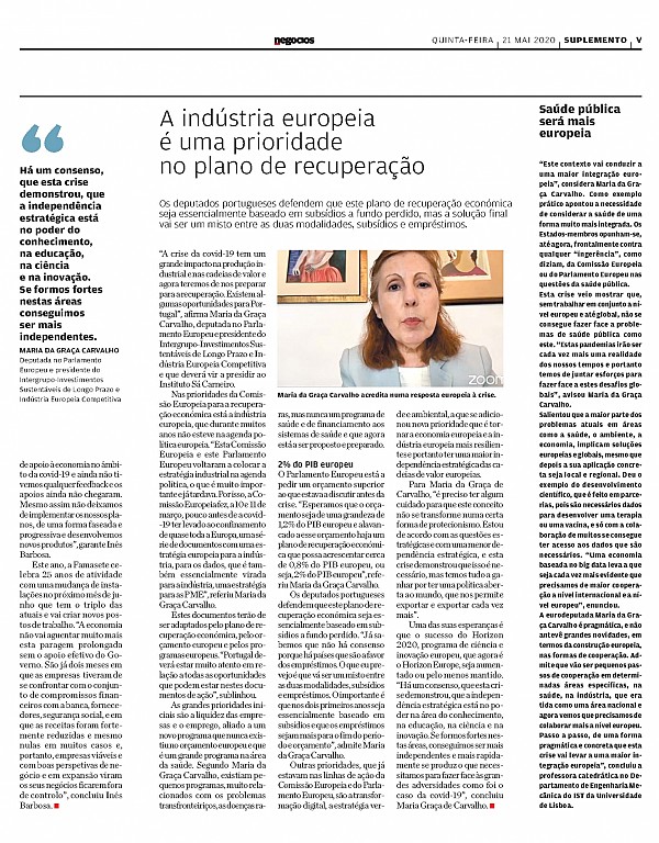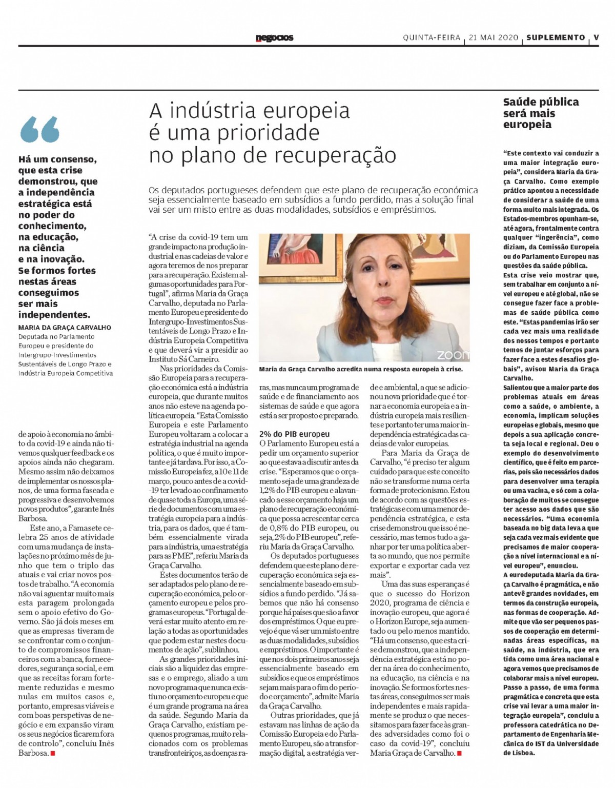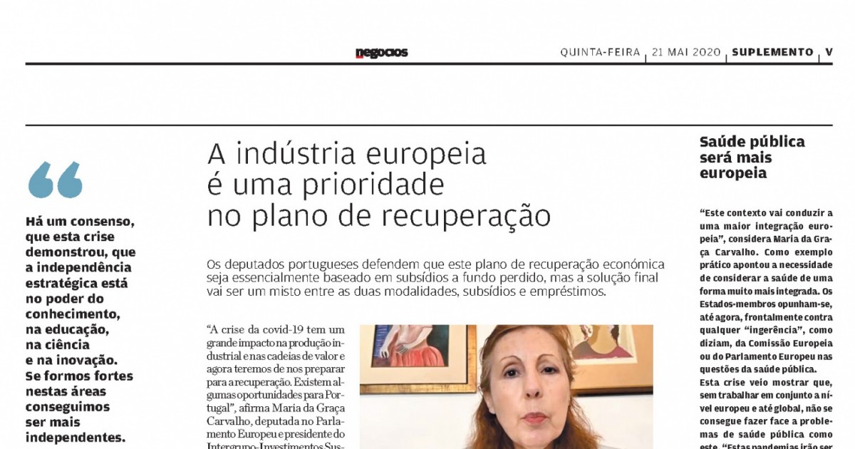 Durante um debate, a eurodeputada Maria da Graça CARVALHO (PPE, PT) falou sobre a importância de investir no sector industrial, relata o Jornal de Negócios. "Esta Comissão Europeia e este Parlamento Europeu voltaram a colocar a estratégia industrial na agenda política, o que é muito importante e já o era nos dias 10 e 11 de Março, imediatamente antes do confinamento Covid-19 de quase toda a Europa, a Comissão Europeia elaborou uma série de documentos com uma estratégia europeia para a indústria, para os dados, que também é principalmente orientada para a indústria, uma estratégia para as PME", afirmou a eurodeputada. As grandes prioridades são a liquidez das empresas e o emprego. A eurodeputada afirmou ainda que o Parlamento Europeu espera que o orçamento da UE aumente para 2% do PIB da UE, a fim de combater eficazmente as consequências da pandemia.