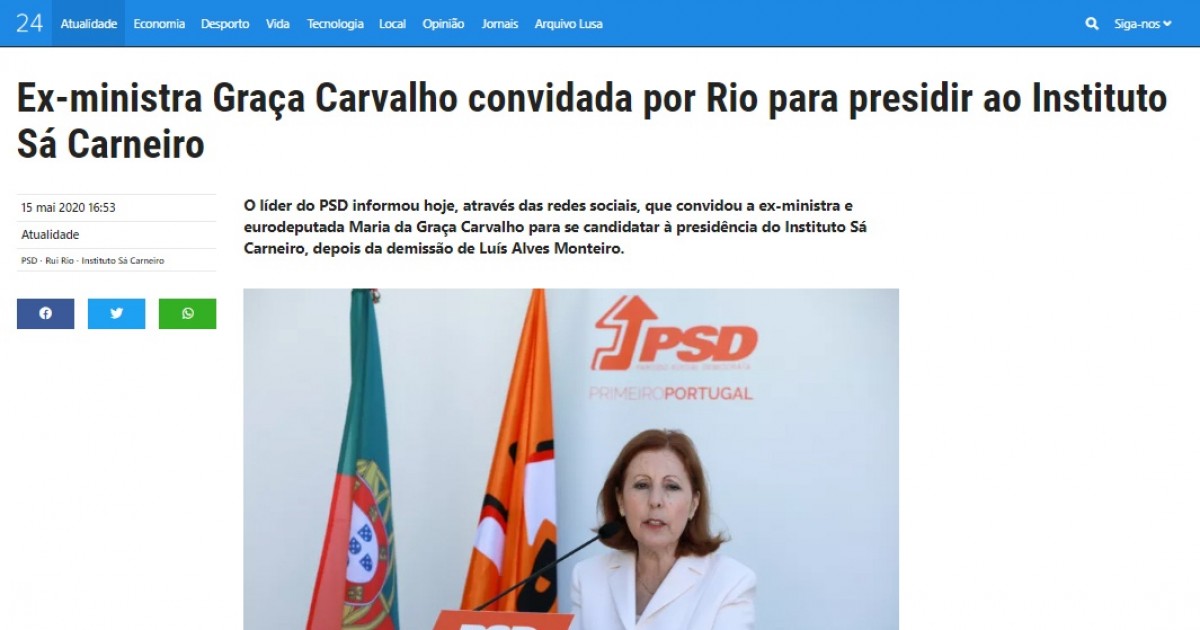 "A Professora Graça Carvalho, ex-ministra da Ciência e do Ensino Superior, aceitou o meu convite para se candidatar a presidente do Instituto Sá Carneiro. A sua equipa irá reforçar o papel deste instituto como braço armado do PSD para a formação política", escreveu Rio.