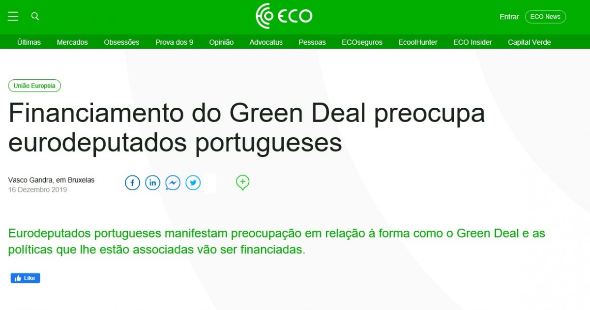 Os eurodeputados portugueses manifestam preocupação em relação à forma como o Green Deal e as políticas que lhe estão associadas vão ser financiadas. E receiam possíveis consequências para as políticas comunitárias “tradicionais” — agricultura e coesão –, ou que o pacto não inclua financiamento à altura das ambições e dos desafios climáticos.