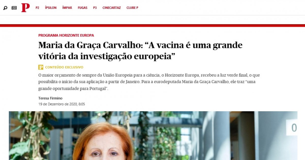 A eurodeputada Maria da Graça Carvalho (PSD), ex-ministra da Ciência e Ensino Superior, traça um balanço positivo do que será o novo programa de financiamento da investigação científica na Europa – o Horizonte Europa (2021-2027) –, enquanto ainda decorriam esta semana as votações finais no Parlamento Europeu deste orçamento de 95.500 milhões de euros. “É um programa muito bom”, afirma, considerando que Portugal começará a sua presidência da União Europeia a 1 de Janeiro num espírito de esperança, porque, por um lado, o Horizonte Europa pode arrancar oficialmente no início do ano e, por outro, a existência de uma vacina da covid-19 trouxe uma luz ao fundo do túnel para a pandemia. Um grande desafio para a presidência portuguesa, acrescenta, vai ser a coordenação da logística da vacinação a nível europeu, uma vez que é uma campanha de saúde pública a uma escala sem precedentes na Europa.